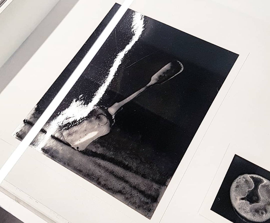 “An Active Grasp” is a study of photographs as objects that are able to convey memory. Looking at personal objects that became embedded in the artist’s own identity, this work brings attention to how they are later approached as objects of affect. It measures their value against their past and the memories they touch on. As photographs are perceived as memories rather than objects, “An Active Grasp” looks at what happens when that process of instant recognition is interrupted by the conditions of the print: when the print itself becomes so unmanageable that the sentimental value of the subject of the photograph becomes obstructed. Through experimentation with photographic material, the print is made to act as memory subject to processes of forgetting: it is fluid, lacking details, and susceptible to change. As the paper won’t absorb the pigment from which the photograph is made, it becomes unfixed. The wet surface reacts to the environment and collects dust. This distortion triggers the viewer’s interaction with the image: as something that is not just transparently given, but which requires retrieval. Looking at such photograph then becomes an active grasp, when only the shapes suggest what the objects might be. Unsharp and obscured, they function more like memory-images than everyday photographs.